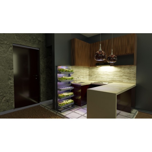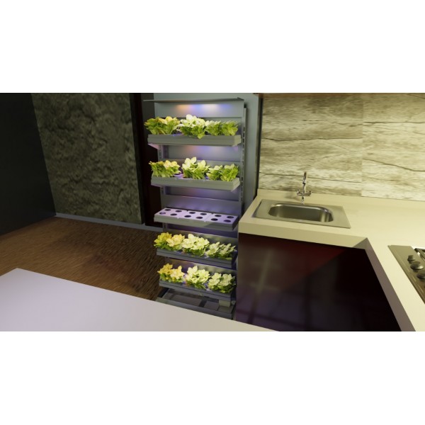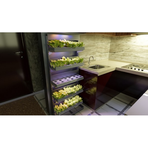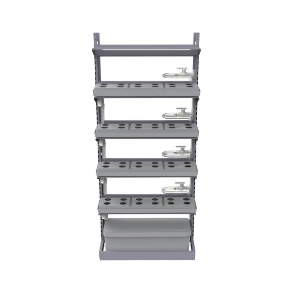 стеллаж, лотки с крышками, клапаны слива, 1 ряд светильников над каждой полкой, ёмкость для питательного раствора, дреннажная система, помпа